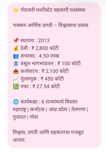 गोदावरी मल्टीस्टेट संस्थेची मुख्य कार्यालयात झालेल्या बैठकीदरम्यान संस्थेची स्थापनेपासून आजपर्यंतची वाटचाल, शाखा विस्तार, वित्तीय व्यवहारांमध्ये स्वीकारलेले तंत्रज्ञान, तसेच पारदर्शक कर्जव्यवस्थापन या बाबींची सविस्तर माहिती समता पतसंस्थेच्या पदाधिकार्यांना देण्यात आली. विशेषतः डिजिटल व्यवहार प्रणाली, ग्राहक सेवा केंद्रांचे सुव्यवस्थित व्यवस्थापन, सभासदांसाठी कार्यरत असलेल्या बचत आणि गुंतवणूक योजना, तसेच सामाजिक बांधिलकीचे उपक्रम यांची माहिती सादर करण्यात आली.